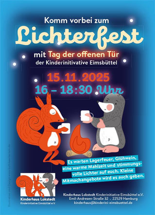 Unser Lichterfest steht wieder vor der Tür! Am 15.11.2025 öffnen wir unsere Türen einmal mehr für Groß und Klein und genießen den hellen Schein der Lichter und die wohlige Wärme des Lagerfeuers. Nach den großen Erfolgen unseres 1. und 2. Tags der offenen Tür dieses Jahr wird unser Lichterfest erstmals auch als Tag der offenen Tür stattfinden! Also packt eure Kinder warm ein und genießt mit uns diesen besonderen Tag voller Weihnachtsmagie in der schönsten Kita in ganz Lokstedt! Wir freuen uns auf euch!